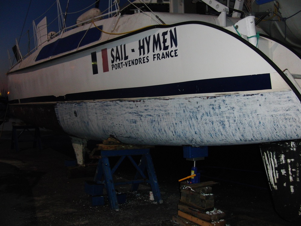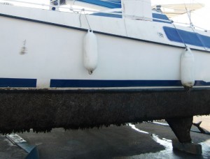 Kurt freut sich über die Helfer und denkt daß er jetzt zu schleifen beginnen kann, aber leider erfolglos – sofort verklebt sich das Glaspapier. Der Grund ist, daß noch immer 3 Lagen Antifouling am Rumpf sind und durch nichts runterzubringen sind. Rot, blau und schwarz übereinander!!!
