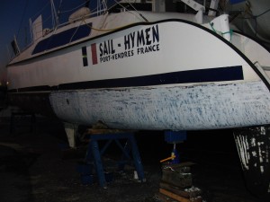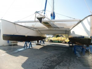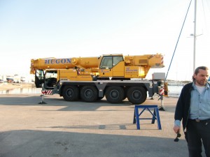 9:30 wir haben uns kleine Gesteller und Holzklötze organisiert und Sailhymen mit Hilfe des riesigen Kranwagens auf den Beton gestellt. Zum Glück alles gutgegangen.