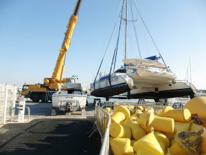 7:50 Wir haben geschickt abgelegt und fahren Richtung Technic Center, wo der Kranwagen schon auf uns wartet. Jetzt wird´s spannend und Sailhymen wird zum ersten Mal mit unserer Hilfe gekrant. Gesagt getan, im Kranwagen sitzt nur der Lenker, kein Helfer ist dabei. Auch im Technic Center ist niemand für unser Kranen zuständig und jedes Teilchen müssen wir uns organisieren.