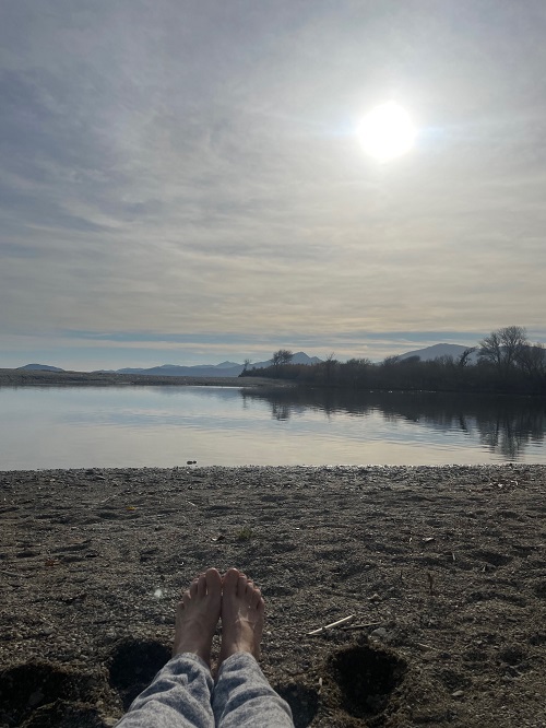 Kurt hat die Löcher mit Harz gefüllt und muss jetzt warten, dass alles trocknet. Somit kann ich ihn zum Fluss verschleppen – d.h. nochmal die ganze Strecke, aber ich freu mich dass er mitkommt.