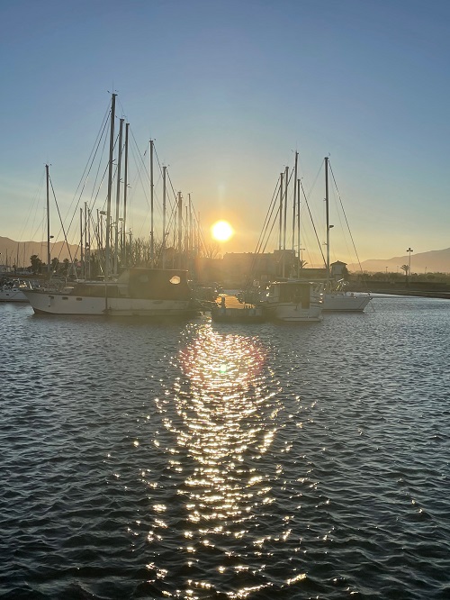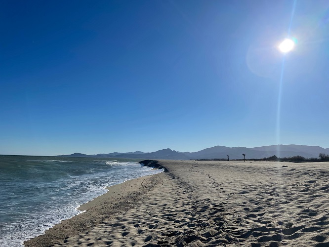 Während Kurt den 1. Teil näht, geh ich kurz zum Strand. Es sieht ja so verlockend schön aus. Nach 10 Minuten des Kampfes gegen den Wind, bin ich wieder zurück. Der Mistral oder Tramontana, wie die Franzosen sagen ist ein sehr trockener Wind, ideal für Fotos. Alles wirkt so kontrastreich und schön, in Wirklichkeit ist es klirrend kalt.