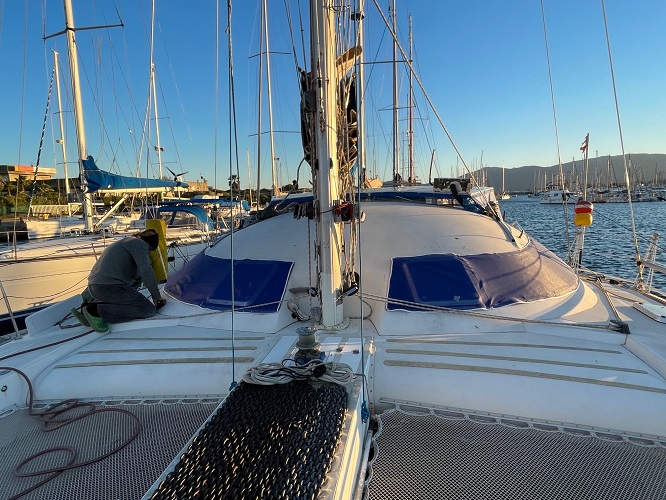 9.00 Die Sonne scheint schon wunderbar, keine einzige Wolke ist zu sehen. Mistral bläst noch kräftig, das ist nicht zu überhören.