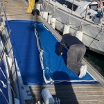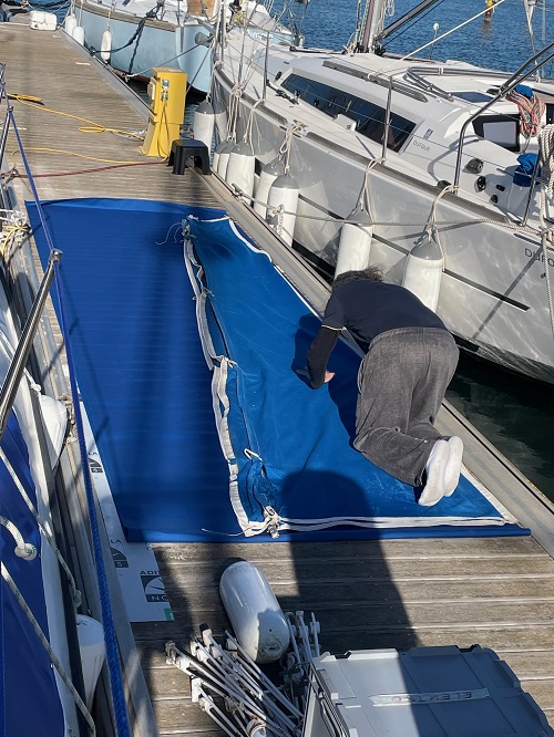Was ist heute zu tun? Der Lazybag ist dran, das ist ein fester Stoff, in dem das riesige Großsegel liegt, wenn es nicht aufgezogen ist.