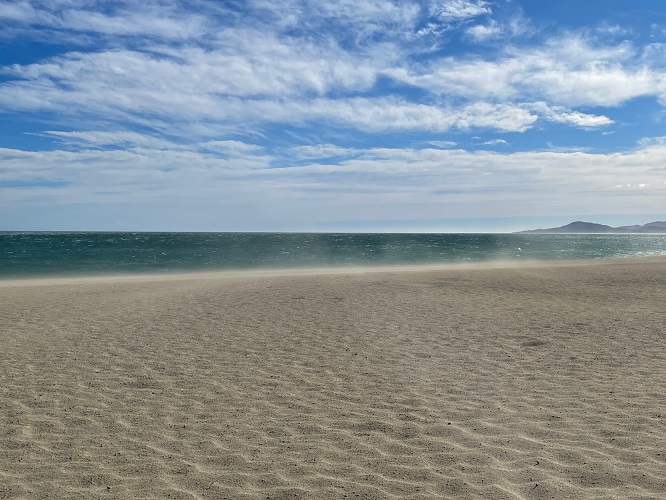 11.00 Ich versuche den Strand zu erreichen, was auf der Straße gerade noch möglich ist. Am Strand wird man Sand gestrahlt. Zum Glück hab ich genug an. Ich hab das einmal im Sommer erlebt. Das tut richtig weh auf den Beinen, der mit Wind Kraft geschleuderte Sand.