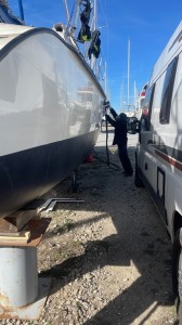Kurt möchte heute an der rechten Außenseite die weiße Bordwand schleifen, immer feiner, bis er schließlich polieren kann. Für kitten reicht die Zeit nicht mehr aus. Das heben wir uns für nächsten Winter auf. Aber wenn die Wand glatt ist, setzt sich nicht so schnell Schmutz an und das ist das heurige Ziel und es spiegelt schon ganz toll.