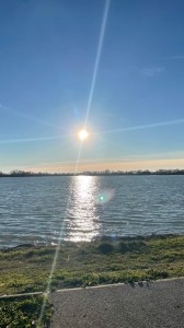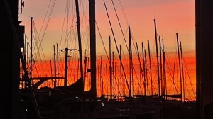 Immer wieder schön und täglich anders in den Farben ist der Sonnenuntergang. Hier gibt es leider keine Stelle ohne Masten. Überall Schiffe!