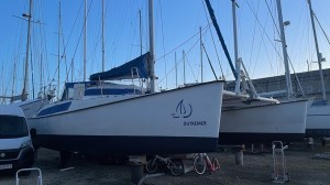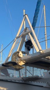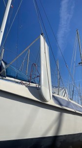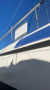 Doch das Schwert hat ihm noch sehr gefuchst, hab ich anschließend gehört und er musste es noch ein paar Mal wieder hochziehen, die Leine besser einhängen und dann noch das untere Ende des Schwertkasten mit einem Stock abkratzen. Dort kommt man mit keiner Maschine hin und nachdem das Ende unter Wasser ist, siedeln sich gerne Muscheln an und dann gleitet das Schwert nicht weiter runter und steckt.