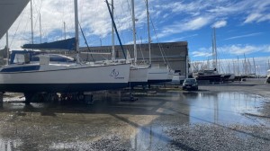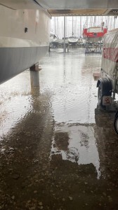 11.00 Der Regen hat aufgehört, Westwind beginnt und bläst das Regenwasser wieder zurück unter das Schiff, wo die tiefe Senke ist.