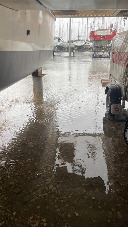 10.00 ich öffne vorsichtig die Türe vom Wohnmobil. Überall wo ich hinsehe, steht Wasser.
