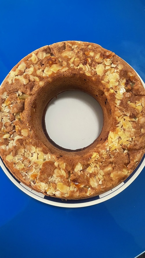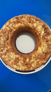 Ich backe einen Kuchen und stell ihn auf den neuen, glänzenden Tisch.