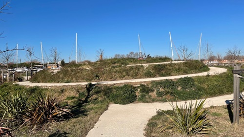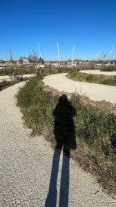 Aber ich hab hier eine Energie Spirale, mitten am Kinderspielplatz. Interessant dass sie es hierher gebaut haben. Nach links geht man hinauf. Oben ist ein kleiner Platz wo man z.B. in alle Himmels Richtungen etwas loslassen kann, oder ein Gebet sprechen, oder sonstiges zum Thema und danach geht man erleichtert nach rechts wieder runter. Und so mach ich dann auch.