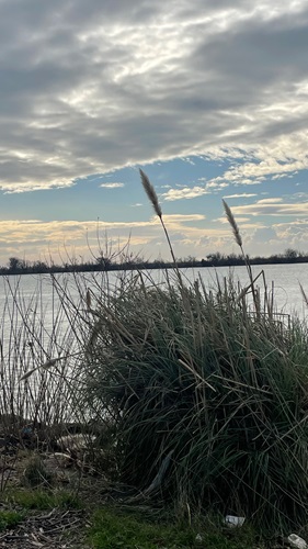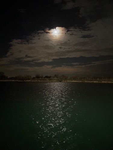 Wir gehen noch eine Abend Runde – ist doch klar oder? Richtung Straße wird es immer lauter. Kurt meint ein Flugzeug, aber es wird immer noch lauter. Es ist völlig windstill, dunkel, niemand hier und ein lautes Rauschen ist zu hören. Das kann nur die Brandung sein von dem Ostwind, der auf Grund unseres NW Windes tagsüber nicht ran kann, aber die starken Wellen kommen ran und sie machen ein unglaubliches Geräusch. Sehr enterisch, wo doch das Meer so weit weg ist. So eilen oft die Wellen dem Wind voraus, sehr spannend!