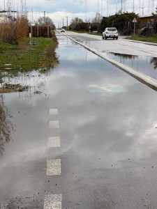 Auch die Straße dort an dieser Stelle in der Kurve hat viel Wasser.