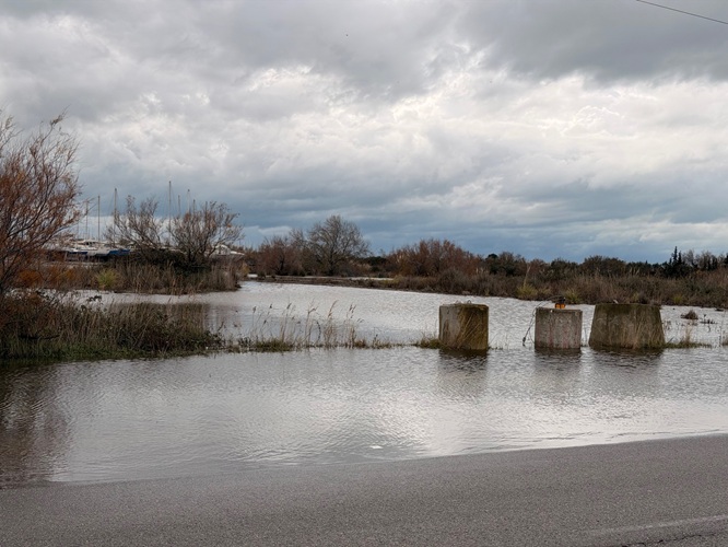 Wir sind in der trockendsten Region Frankreichs, normal fällt hier kaum Regen. Die Regenlaken ziehen sich ins Land hinein. Es sieht aus als wäre dies die Lagune. Normal ist hier aber nur trockenes Land mit roter Erde.