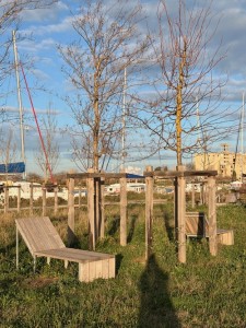 In der Wiese stehen Liegebetten aus Holz. Sehr hübsch ist der Park gestaltet und es ist nicht sehr weit weg von uns am Weg in den Ort.