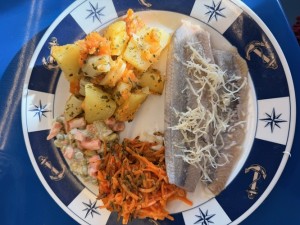 Es gibt heute besonders gesundes Essen, den rohen Bismarck Hering, der hier so gut schmeckt. Oft nehm ich auch eine Packung mit nach Hause.