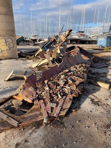 Das war einmal ein Beton Schiff. Wir waren dabei, wie ein riesiger Bagger es zertrümmert hat auf kleine Stückchen. Unglaublich. Der Motor steht extra.
