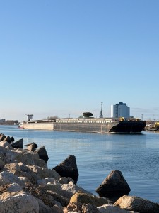 Wir gehen ein wenig am Kanal spazieren als ein riesiger Schubverband sich den Kanal hinunter abmüht. 2 große Schubschiffe, die von einem Schiff geschoben werden. Bravourös machen sie dies in dem engen Kanal.