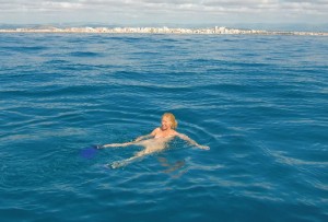 Ein morgendliches Bad geht sich fast immer aus. Mitten am Meer: Motor aus und rein ins Wasser sobald das Meer sauber und schön blau wird!