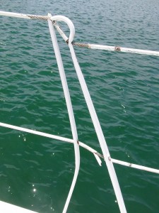 Ein vermutlich grosses Schiff, wir nehmen an ein Segelboot, hat zwischen April und Juni unsere Reling beschädigt, aber leider keine Versicherungsmeldung gemacht und auch das Marinabüro weiß nicht Bescheid. Somit können wir diesen Teil nur neu machen oder überhaupt eine neue Reling anfertigen, aber das hat noch Zeit. Im Moment ist noch Wichtigeres dran.