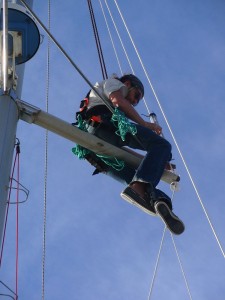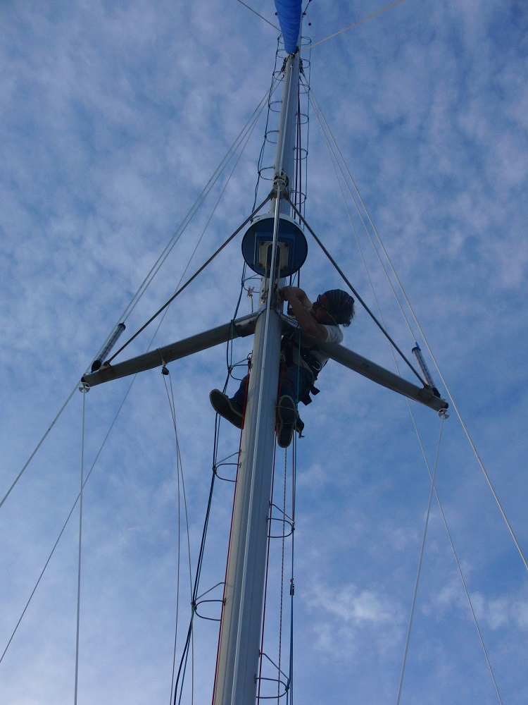 19.00-21.00 Kurt ist wieder am Mast, mit Sicherung und ich bediene die Winsch und zieh ihn rauf und lass ihn wieder runter: Backstage werden getauscht, das Flaggenband gewechselt, Die beiden Radarreflektoren montiert. Der Wind bläst weiter unentwegt.