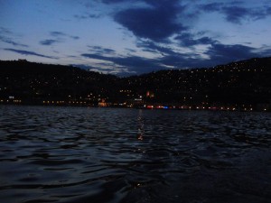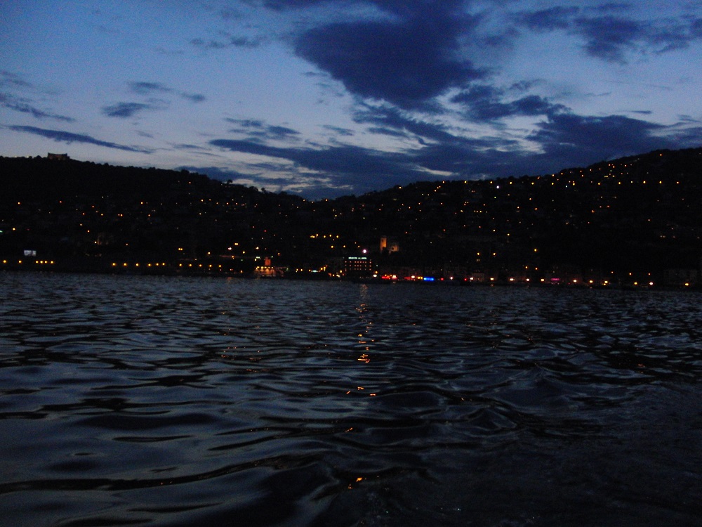 Weil wir so fleißig marschiert sind, gönnen wir uns noch ein Eis. Die Sonne geht unter und die Bucht ist ein einziges Lichtermeer, als ob ich auf einen Sternenhimmel schau. Ein Freiluftkino spielt in der Ferne einen Film und die Burgen sind beleuchtet. Mild und windstill ist es. Beim Schiff merken wir nichts vom Diesel, dazu sind wir zu weit weg vom Hafen, zum Glück.
