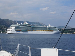 In der Bucht steht ein riesiges Kreuzfahrtsschiff vor Anker und die Ausflugsboote karren die Touristen an Land.