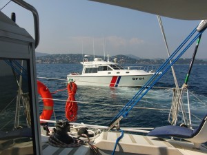 Noch 3 Stunden bis Saint Tropez! Die Männer schlafen, Christina und ich halten Ausschau. In der Bucht von St Tropez ist plötzlich Blaulicht hinter uns. Ich nehm nicht an, daß die zu uns wollen, wecke aber sicherheitshalber Kurt auf. Französische Zollner stoppen unser Boot und wollen unsere Papiere sehn und stellen viele Fragen.