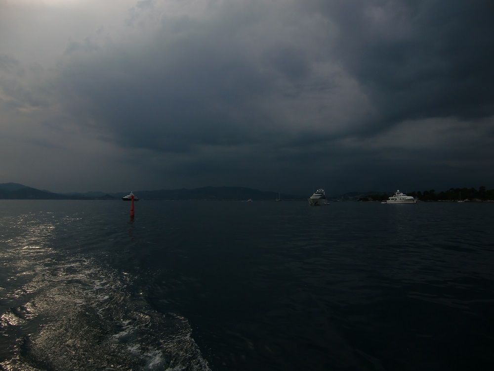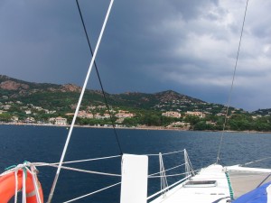 Wir wollen weiter nach Antibes, aber es ist völlig zugezogen und in den Bergen donnert es! Abwarten ist angesagt! Die Bucht von Agay füllt sich mit Booten, die sich von draussen reinflüchten! Wetterberichte sagen keinen Wind voraus, aber es ist ja auch Gewitter und da stimmen meist keine Wetterberichte.