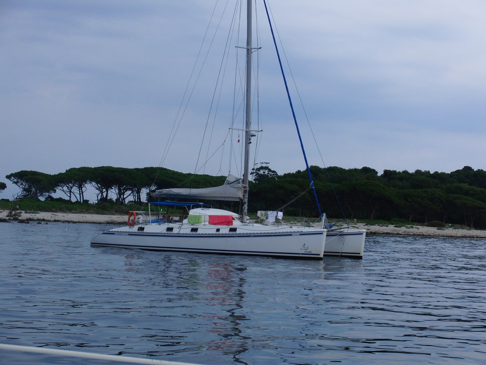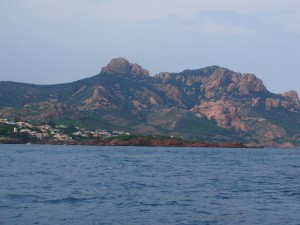 Eine Weile lang fahren wir an den roten Gebirgen vorbei, bis das Land wieder ebener wird. 3 Stunden teilweise wellige Fahrt, aber nicht vom Wind, sondern eher von anderen, großen Yachten, die uns überholen oder knapp an uns vorbeifahren. Bei den Inseln vor Cannes sehen wir einen anderen Outremer.