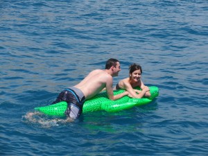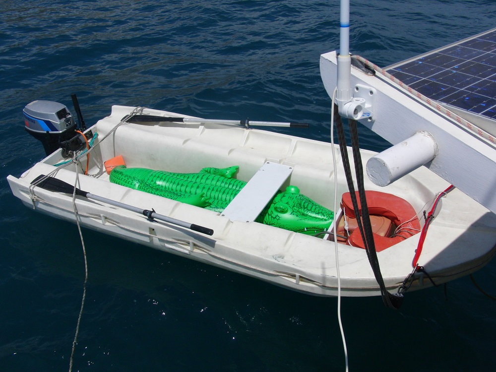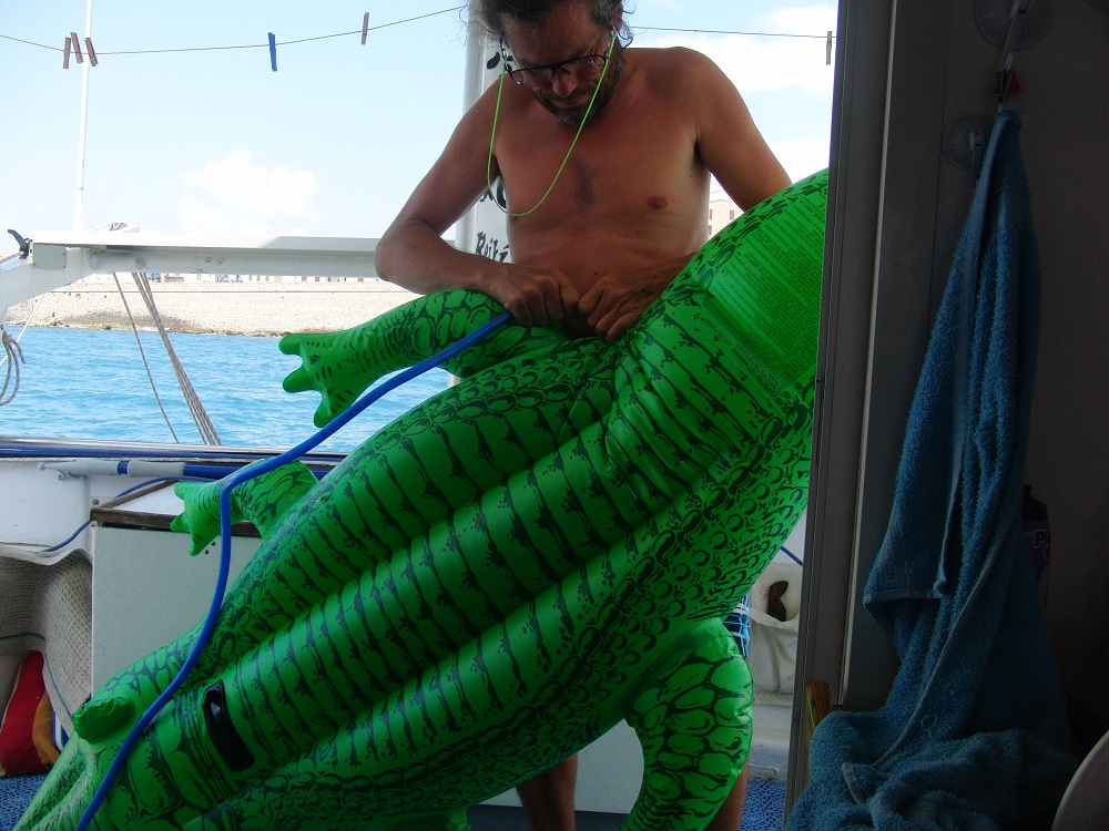 Die Sonne hat uns wieder gefunden! Blauer Himmel aber dafür kühleres Wasser, 22 Grad. Unser am offenen Meer gefundenes Kroko darf heute auch ins Wasser. Aufblasen geht aber nur mit Kompressor da es so groß ist.