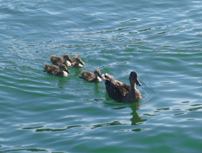 Eine Enten Familie schwimmt vorbei mit ihren 4 Jungen, so süß.