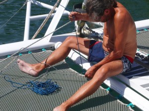 13:00 ein alter Mann regt sich furchtbar auf, dass wir hier geankert und festgemacht haben, in der Nähe seiner Boje und möchte, dass wir verschwinden, ergab zumindest seine Zeichensprache. Nachdem wir nichts tun greift er drohend zum Handy und ruft jemand an. Laut Reiseführer und Internet kann man im Kanal festmachen und ankern wo man möchte.