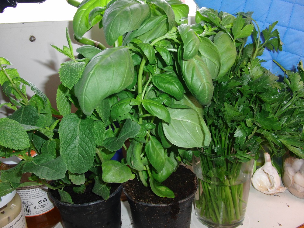 Ich hab mich schon eingerichtet fürs länger bleiben und heute Küchenkräuter gekauft. Basilikum, Minze  und Petersilie. Die Minze ist ziemlich grob und derb, nicht so fein wie meine Hugominze in Wien war.