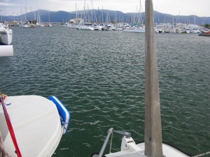 Grauer Himmel und sogar im Hafen sind kleine unruhige Wellen.