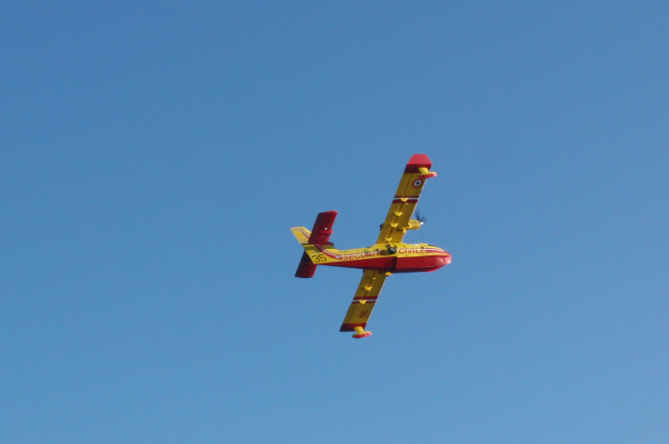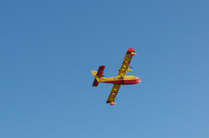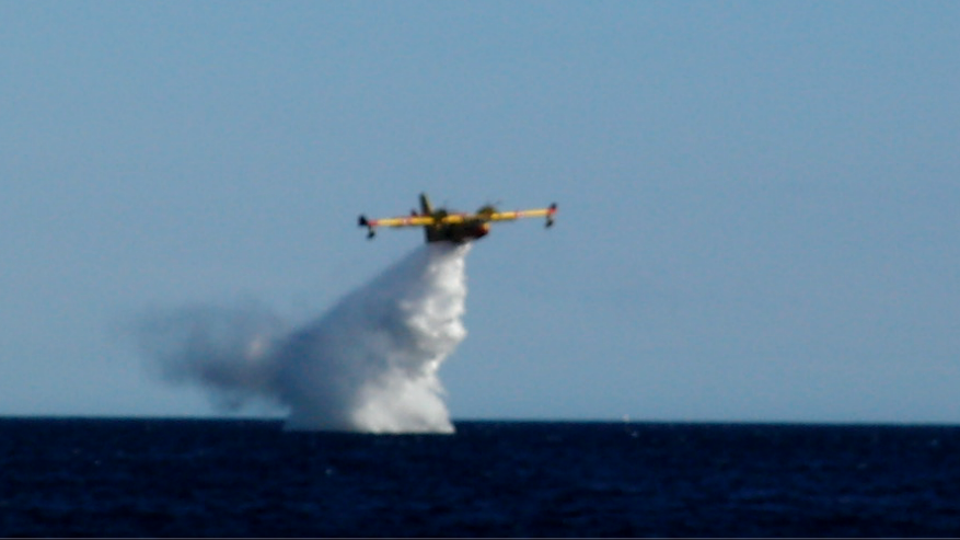 19:00 Das gelbe Löschflugzeug zieht wieder seine Übungsrunden, nimmt Wasser auf, wirft es wieder ab.