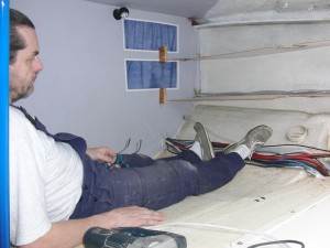 So! Jetzt geht´s weiter mit dem Umbau der Gästekabine. Fächer und Regale raus schneiden, nicht mehr gebrauchtes Kabelzeug wegschneiden oder ausfädeln, stemmen, stauben,…….und morgen wieder zu poliestern!