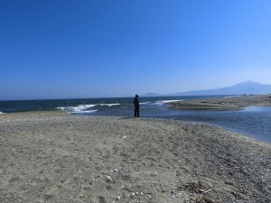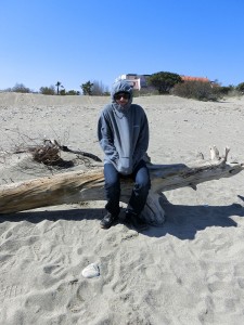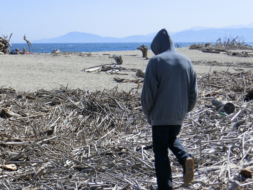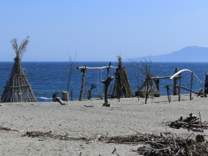 Wir marschieren bis zur Flussmündung, kommen an freien Stränden vorbei mit nackten Menschen, dann nackten Männern, viel angeschwemmtes Holz und aus Holz gebaute Hütten, spielplätze, Zelter, …..