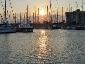 Es ist strahlender Sonnenschein, viele Segelboote segeln den Strand entlang, da Ostwind. Ideal um auf und ab zu segeln!