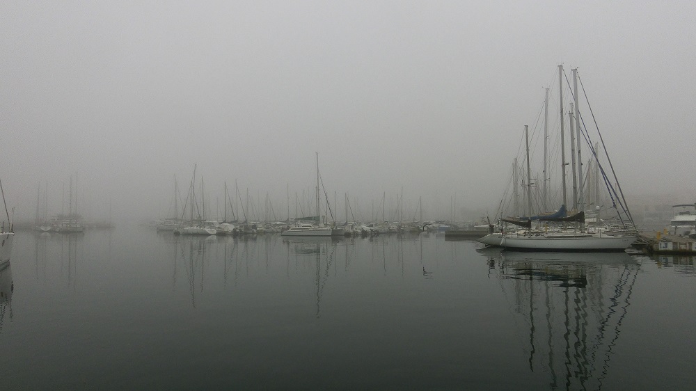 Ein Blick aus dem Schiff nimmt mir die Entscheidung ab. Was ist denn mit dem Wetter passiert. Voller Nebel und 10 Grad!