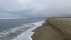 Wir nehmen eine kleine Jause zu uns, der Nebel hat sich gehoben, allerdings ist es immer noch kühl und keine Sonne. Ich zieh mich gut an und geh zum Strand.