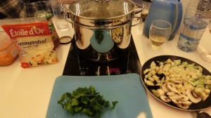 Unser neuer Spaghettitopf für Induktion – etwas groß haben wir ihn gekauft – wird heute eingeweiht, ich freu mich sehr. Für mich viel Gemüse, gute Öle, geriebenen Emmentaler, für Kurt rote Sauce.