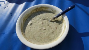 Als Nachspeise haben wir heute Zitronenyoghurt mit Löwenzahnpulver und Hanfblatt und Gojibeeeren. Eine ganz spezielle Mischung. Schmeckt sogar gut!