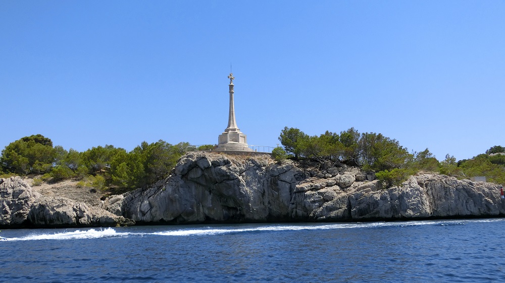 15.00 wir machen eine Runde mit dem Beiboot und sehen uns die Küste an und auch wo man leicht das Beiboot für den Landgang befestigen kann. Vor der Marina am Felsen ist der Turm mit dem großen Kreuz, schon von weitem sichtbar.