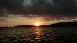Über der Bucht bildet sich eine schwarze Wolke, Regen und Gewitter kommen zum Glück nicht.