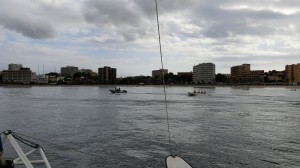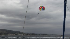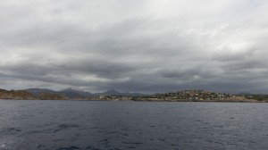 22.30 Eigentlich wollte ich nach dem Essen noch die Strandpromenade ablaufen. Leider ist der Wind dagegen und beginnt heftig zu blasen und Wellen zu bereiten. Wir kontrollieren die Wetterberichte und haben bei 3 Wetterberichten 3 wirklich ganz konträre Aussagen, von 5 Knoten bis zu stürmischen 30 Knoten. Welchen dieser Wetterberichte werden wir vertrauen. Wir stecken noch Kette und haben jetzt beinahe 60m Kette bei 4m Wassertiefe. Das muss auch halten, wenn wirklich Sturm kommt, angeblich im Morgengrauen. Wir sind vorbereitet! Unangenehm können höchstens die Wellen werden, wenn wirklich so viel Wind kommt, denn die kommen vom Flughafen und von Osten und können auf dieser Strecke noch Größe zulegen.