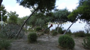 Auf einer kleinen Halbinsel ist ein Park angelegt mit Kunstwerken, aus Holz, bemalen.