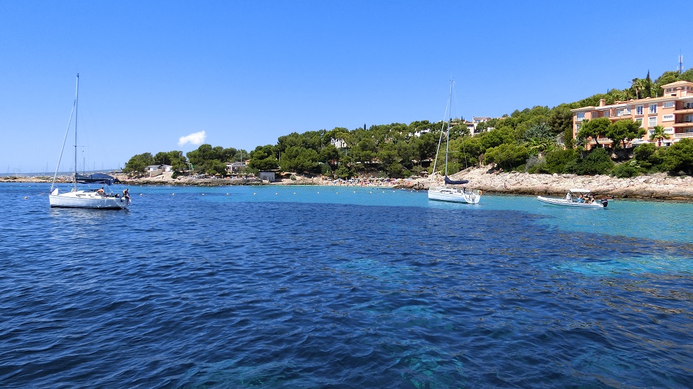 Der Wind kommt aus Südwest, daher können wir endlich wieder einmal alle Segel aufziehen und die große Bucht mit über 8 Knoten Geschwindigkeit queren bis zu den Bojenplätzen vor El Arenal. Da freut sich das Schiff! 60-90 Grad ist der Lieblingswindwinkel der meisten Boote.