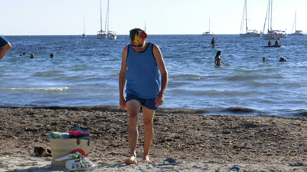 9.30 Ein Blick aus allen Luken sagt, wir haben uns gedreht, denn der Wind hat aufgehört in der Nacht. Wir stehen Richtung Inselchen, und es ist alles in Ordnung. Mal sehn, ob es noch ruhig ist und wie kalt das Wasser ist. 23,7 und wir haben nurmehr 2,5m Wasser unterm Schiff. Beim Schwimmen ist es etwas enterisch, alles bewegt sich unter mir, Fischlein, Seegras. Ich zieh die Zehen ein beim Schwimmen, obwohl ich bei 2,5m sowieso nicht am Meeresgrund ankommen kann. Aber es ist so deutlich zu sehen. Mit gut gekühltem Körper geh ich Kurt aufwecken.