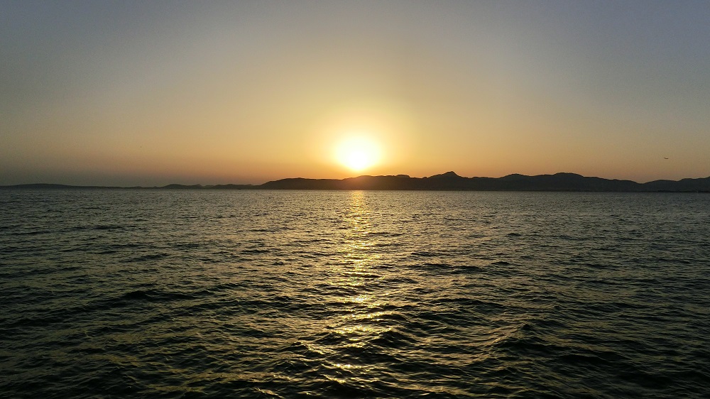 Die Sonne geht unter, der Mond steigt auf, genau gegenüber und ist in seiner vollen Größe zu sehen. Einige Sterne leuchten auf uns herab.